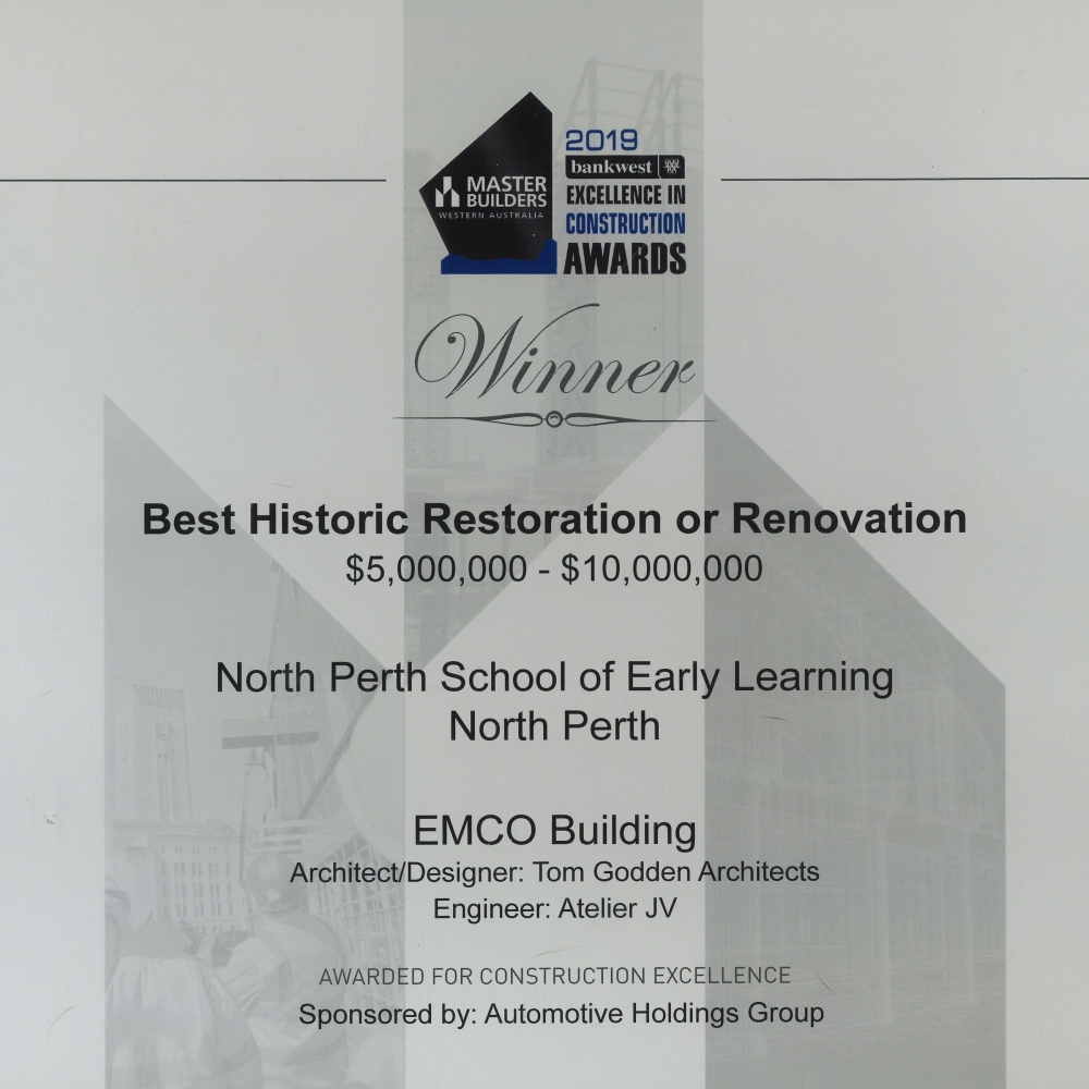 The Skyplay: North Perth School of Early Learning was awarded the Best Historic Restoration or Renovation ($5,000,000 - $10,000,000) in the MBA 2019 Excellence in Construction Awards. Atelier JV worked together with Tom Godden Architects as the engineer for this project.